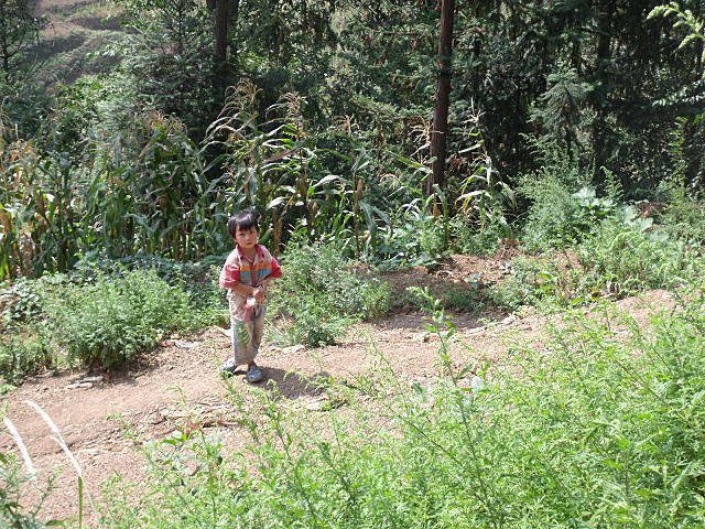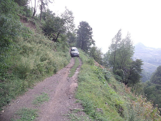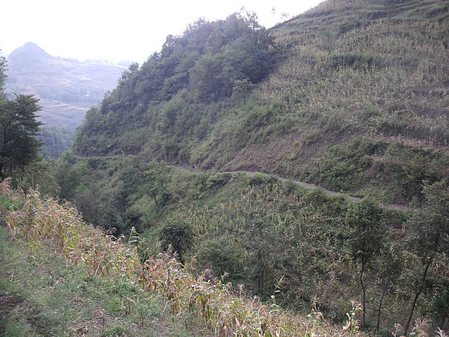 2011-9-17周老师走访途中:在这样狭窄的山路上会车非常困难,对面一辆装玉米的农用车就使周老师走访的车子无法通过,很花了些时间才避让过去……