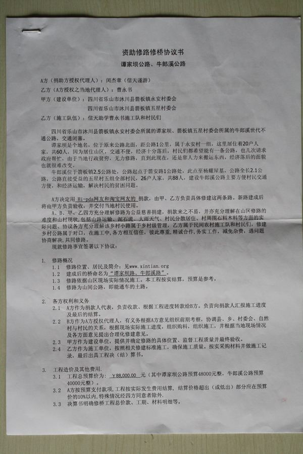 说明:谭家坝公路决算为38000元,牛郎溪公路决算为40000元整。两条路共计集资78000元。 HI-PDA恒心计划捐资35000元(谭家坝和牛郎溪这两条公路的修建费用,余款由淘宝店集资解决。)截止2010年9月18日,谭家坝公路项目在淘宝店共统计三次,累计收集善款39585元,截止2010年12月16日牛郎溪公路在淘宝店收款总额为4845元(2010.9.20-2010.12.16,详见http://www.xintian.org/bbs/cn/vi ... &extra=page%3D1),因此捐款总额为35000元+39585元+4845元=79430元。比决算超出79430元-78000元=1430元,超出款项后用于三块田公路的修建。详见http://www.xintian.org/bbs/cn/vi ... ra=page%3D1#pid6335,谢谢。