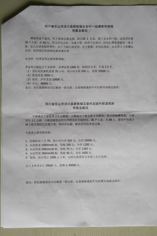 备注:(1)村民根据情况可以集资一部分款,以备修路遇到不可知费用或路边保坎。