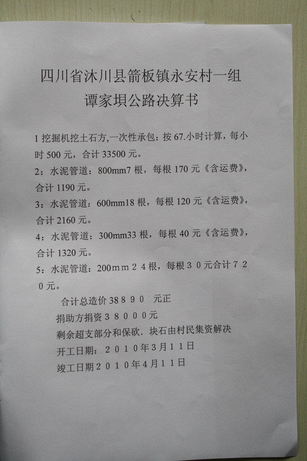 淘宝店出售项目金额汇总—第8条:四川沐川县永安村一组谭家坝公路2期(2010.8.15-2010.9.18)