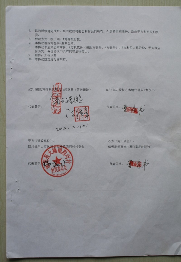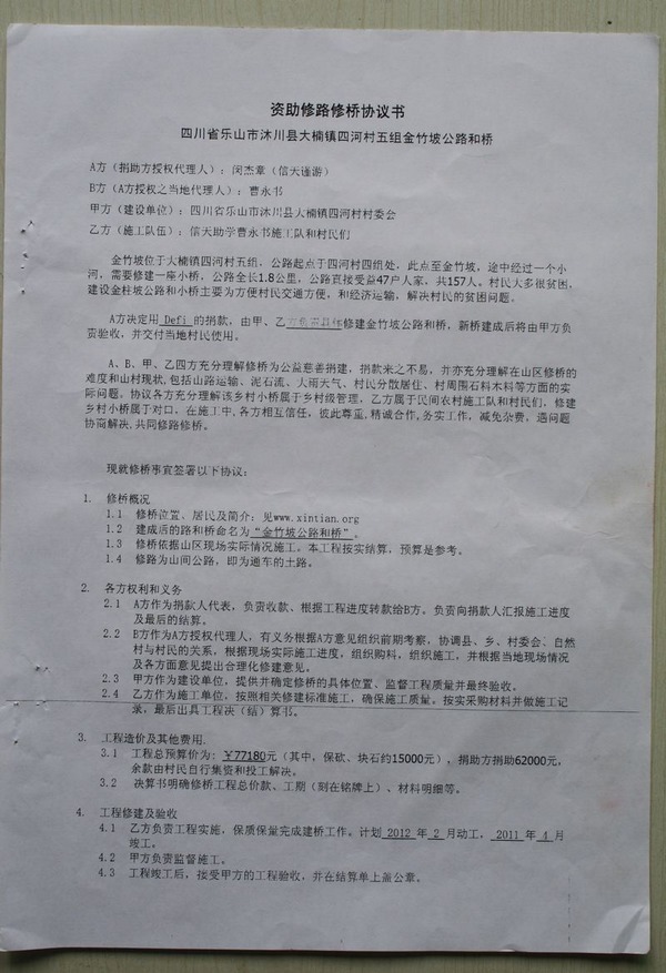 捐助方捐助62000元,余款由村民自行集资和投工解决。谢谢!