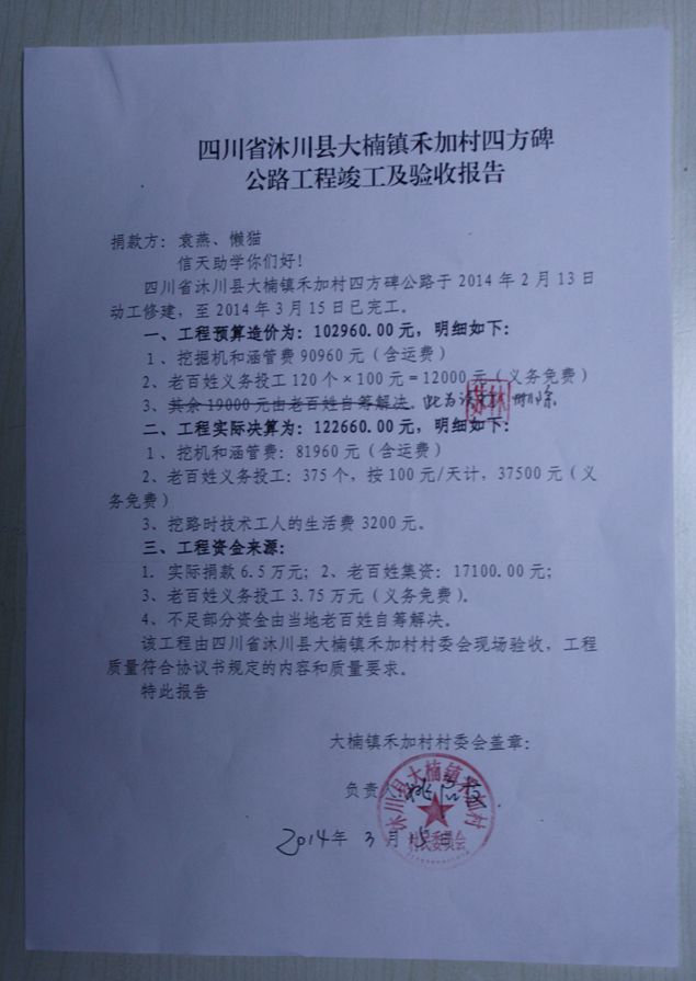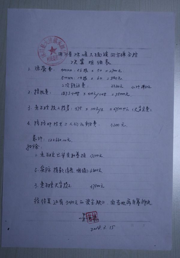 老百姓义务投工投劳,并集资购买涵管6960元,资金缺口84000元