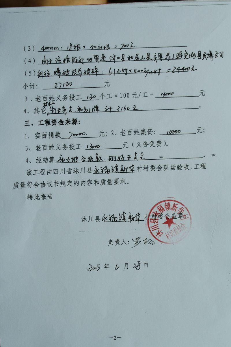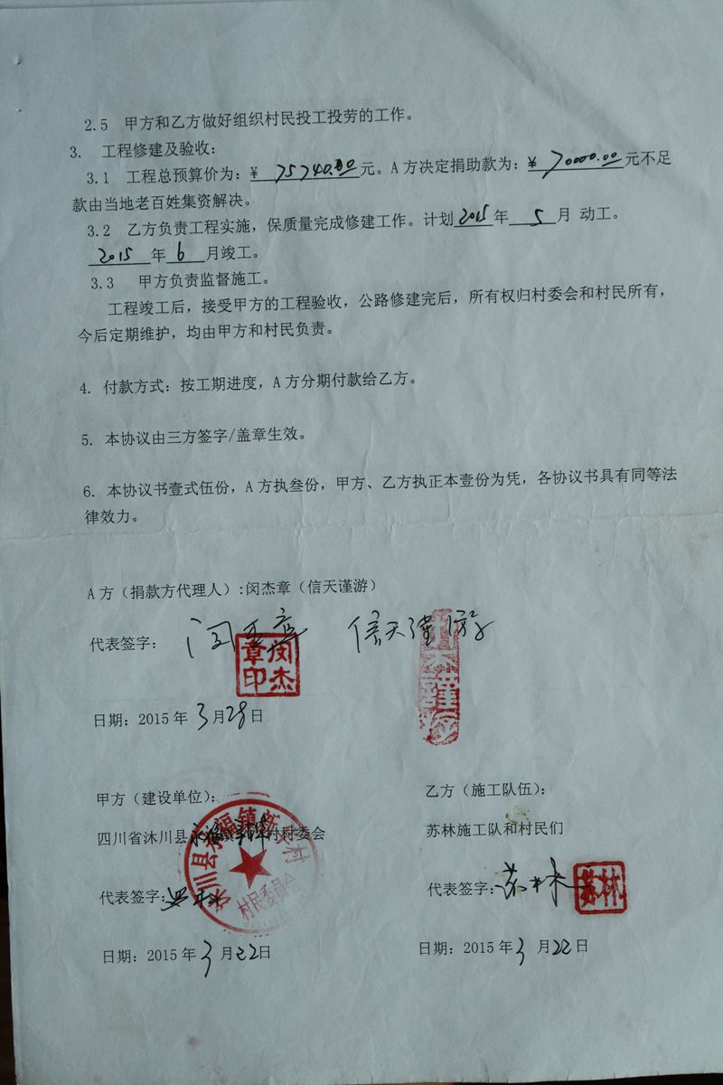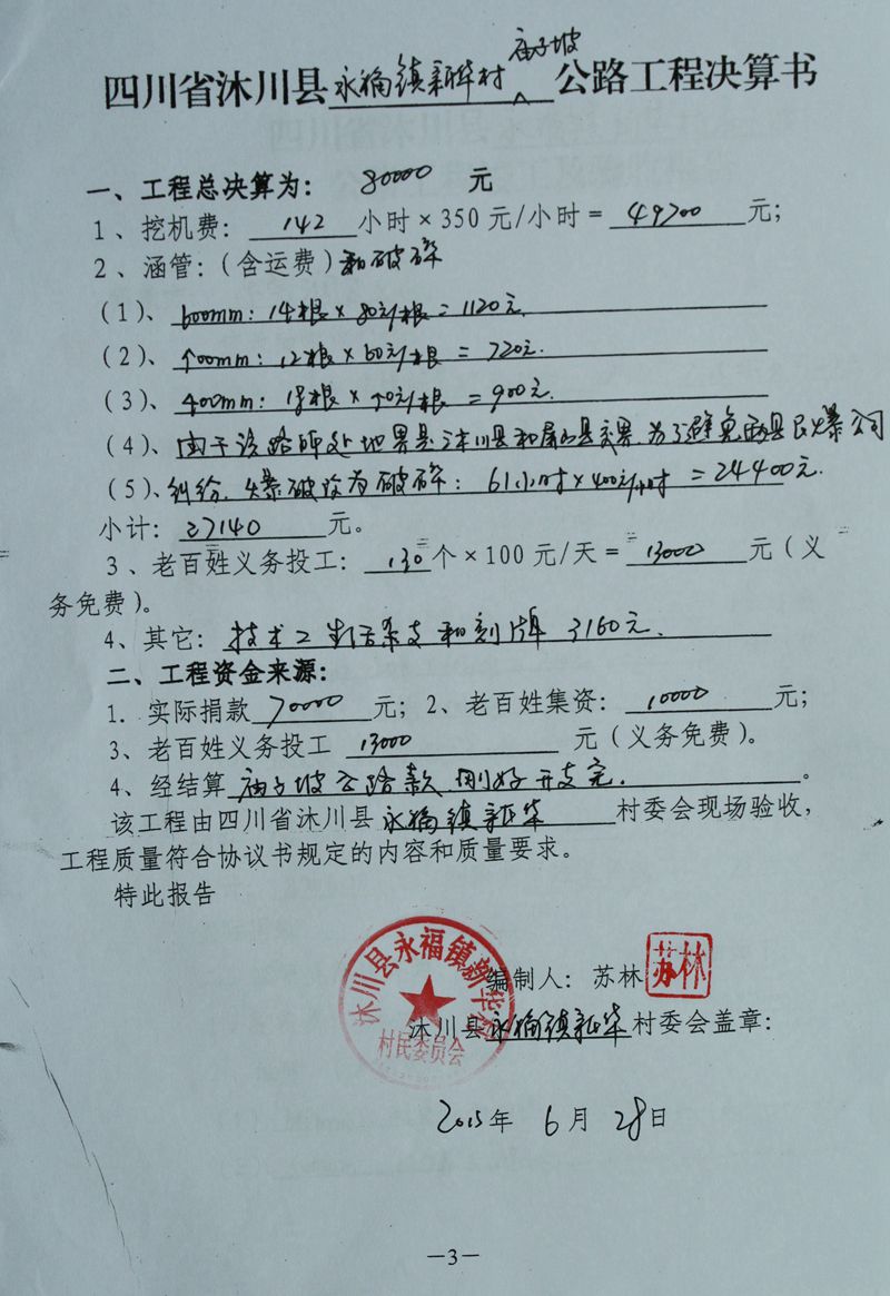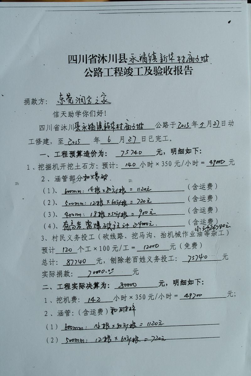 (5)修路预算分好几部分,有挖掘机、涵管、炸药爆破(山崖需要爆破)、堡坎、村民义务工、征地等。修路,我们不全包,我们出一大部分钱:挖掘费用、山崖爆破等。村民出义务工、涵管、征地费、村民小额集资。
