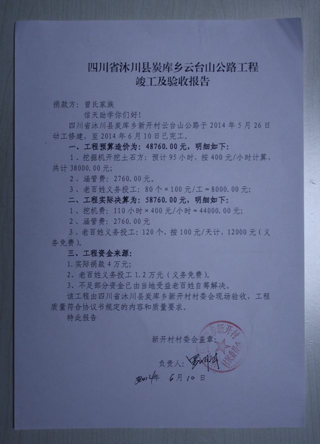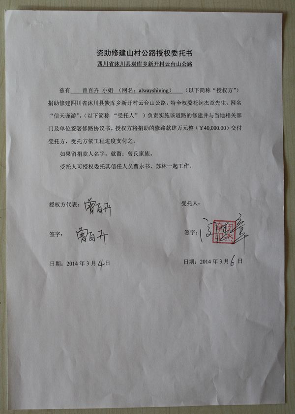 信天助学决定捐助40000元。 本条路的捐款人最后确定是:alwayshining(曾氏家族)