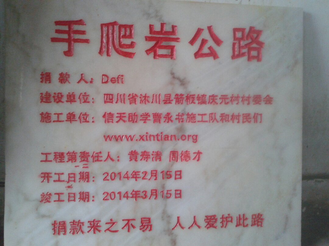 手爬岩公路简介:该路位于箭板镇庆元村委会1组边界到行路村10组,途径手爬岩,全长约2公里。该路地势险要,悬崖遍布,岩石丛生,修路需要爆破。直接益农户45户,直接受益人数220余人。村民大多很贫困,修建此路主要为方便村民出行方便,和经济运输,解决村民的贫困问题。