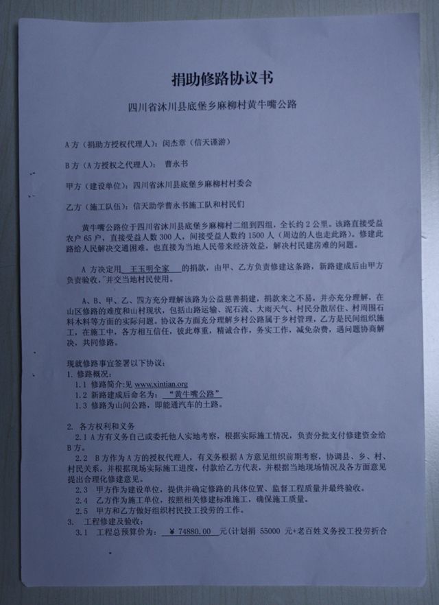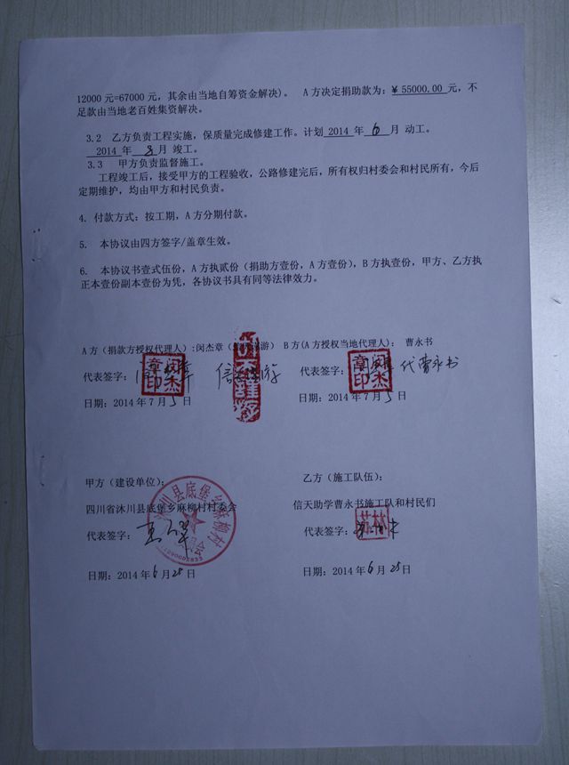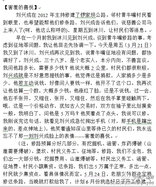 (4) 有的地方村民太困难,在大山更深处,这样,我们就尽量不让村民再集资了,只投工投劳就可以了。而,有的地方小水泥路就通到了山脚下,我们修路来接通外界的小水泥路,这样,材料可以直接运输到山脚下,村民除了投工投劳,就再集资一些钱,我们共同修建山村公路。