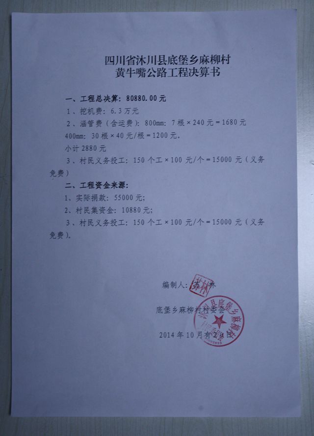 (5)修路预算分好几部分,有挖掘机、涵管、炸药爆破(山崖需要爆破)、堡坎、村民义务工、征地等。修路,我们不全包,我们出一大部分钱:挖掘费用、山崖爆破等。村民出义务工、涵管、征地费、村民小额集资。