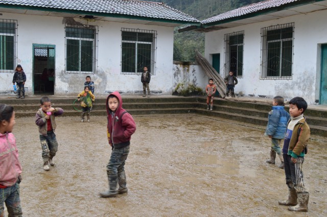 校门口的道路是泥巴路,同学们到了学校,也把泥巴带进了操场(操场已经做了水泥硬化)。操场内都是泥巴,同样,也把泥巴带进了教室。