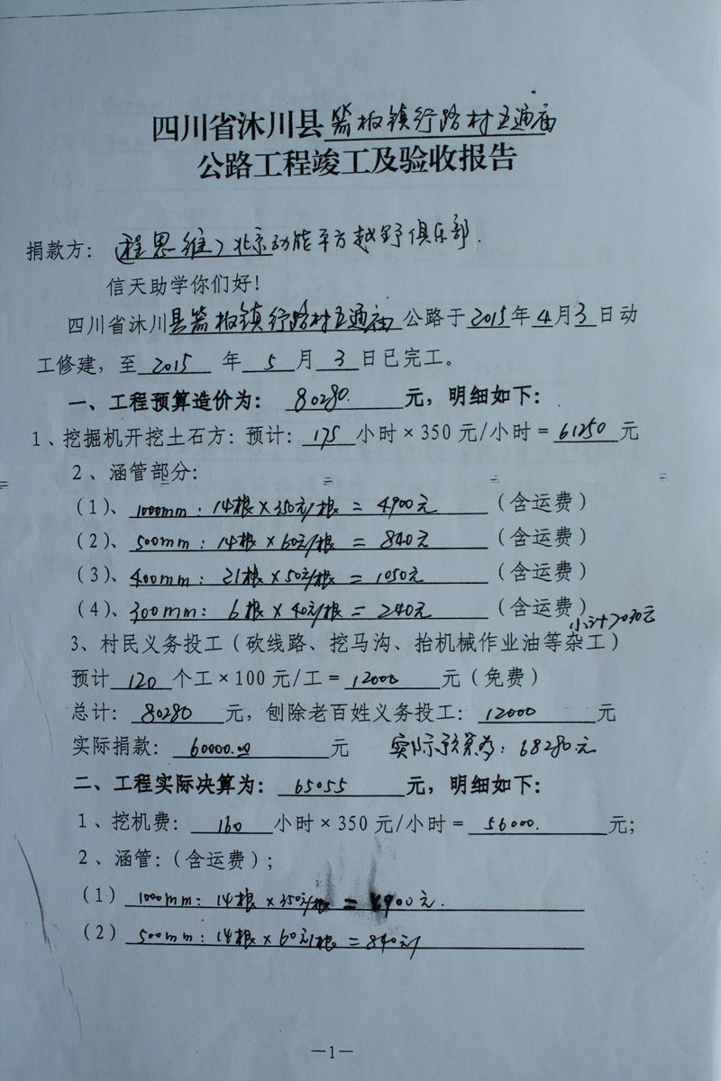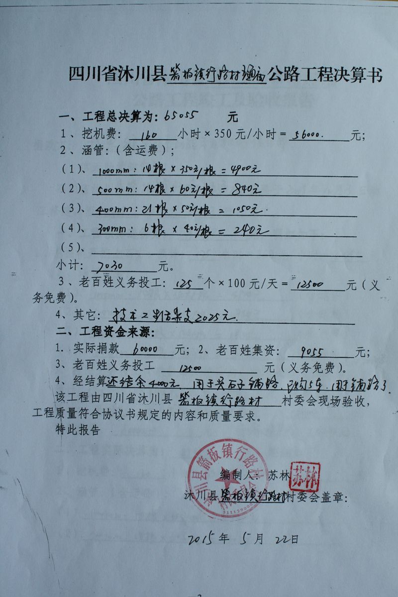 (5)修路预算分好几部分,有挖掘机、涵管、炸药爆破(山崖需要爆破)、堡坎、村民义务工、征地等。修路,我们不全包,我们出一大部分钱:挖掘费用、山崖爆破等。村民出义务工、涵管、征地费、村民小额集资。