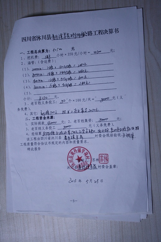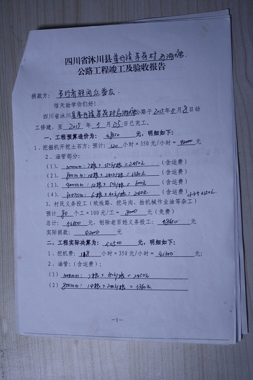 (5)修路预算分好几部分,有挖掘机、涵管、炸药爆破(山崖需要爆破)、堡坎、村民义务工、征地等。修路,我们不全包,我们出一大部分钱:挖掘费用、山崖爆破等。村民出义务工、涵管、征地费、村民小额集资。