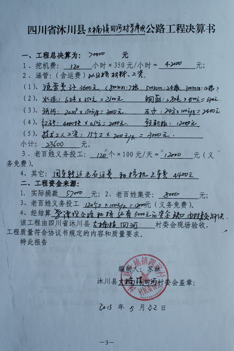 路修好了,公示,红榜下面是每条路的修建协议书、预算、结算、竣工验收报告等资料。