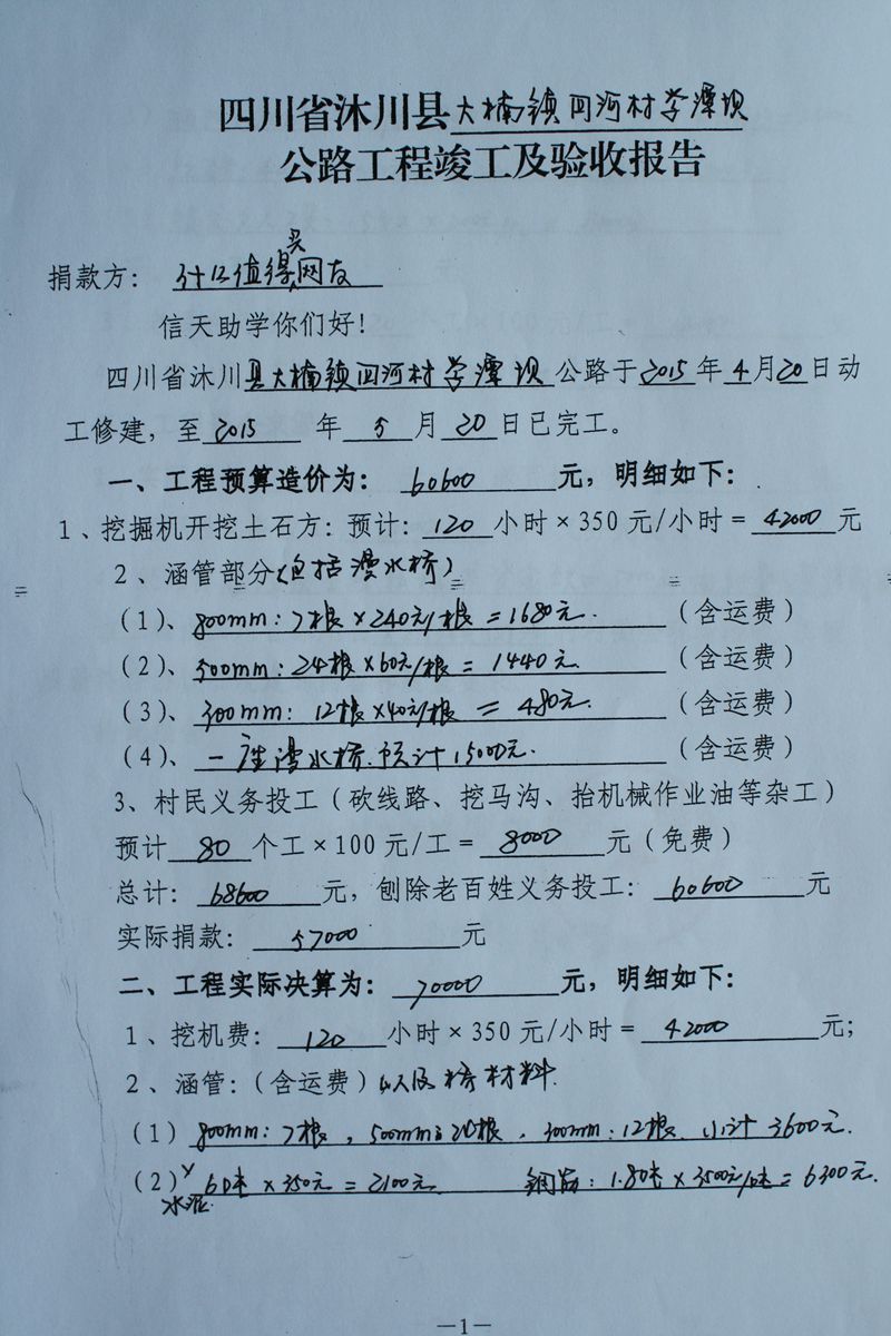 (5)修路预算分好几部分,有挖掘机、涵管、炸药爆破(山崖需要爆破)、堡坎、村民义务工、征地等。修路,我们不全包,我们出一大部分钱:挖掘费用、山崖爆破等。村民出义务工、涵管、征地费、村民小额集资。