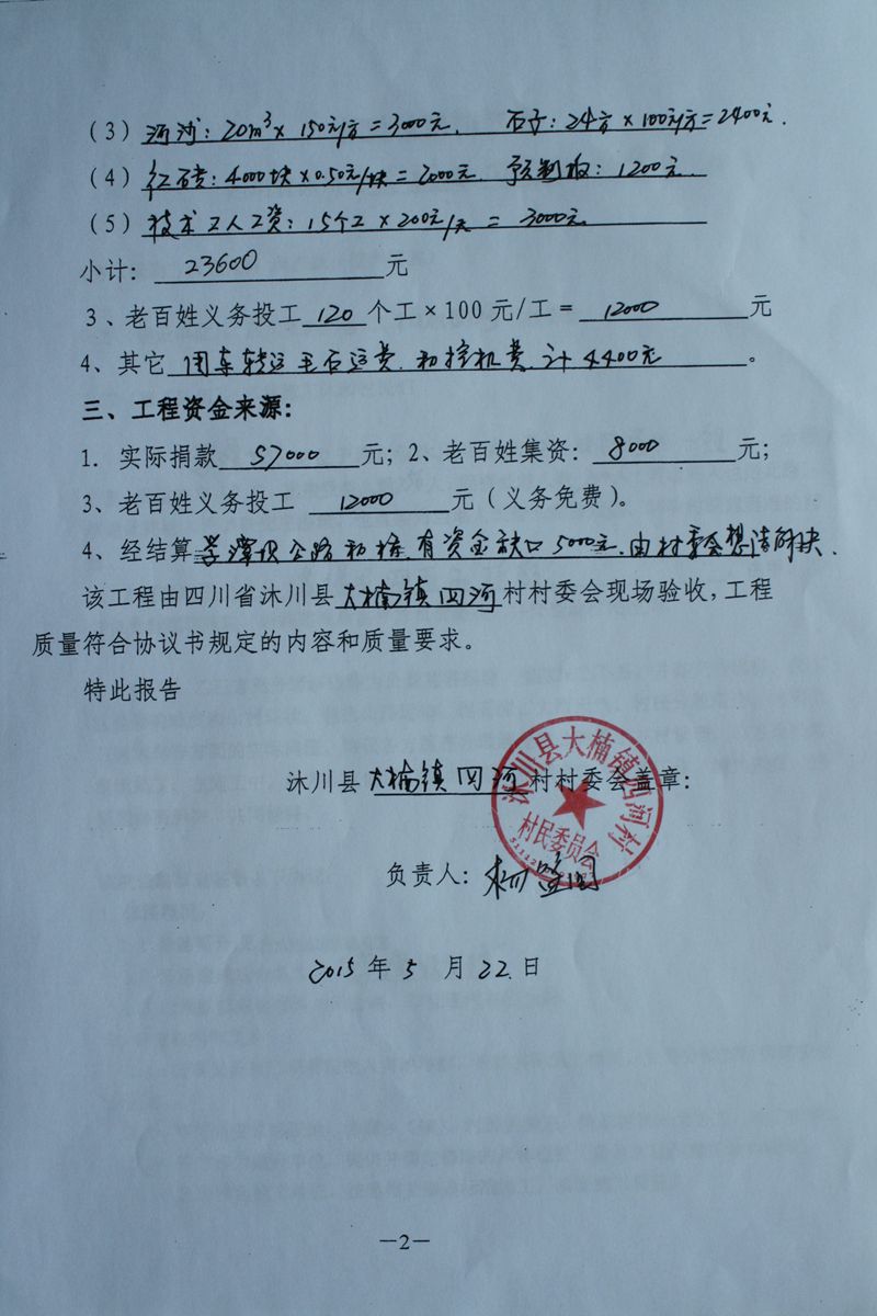 捐助:伍万柒仟元整(小写57000元),涵管由村民集资自理。