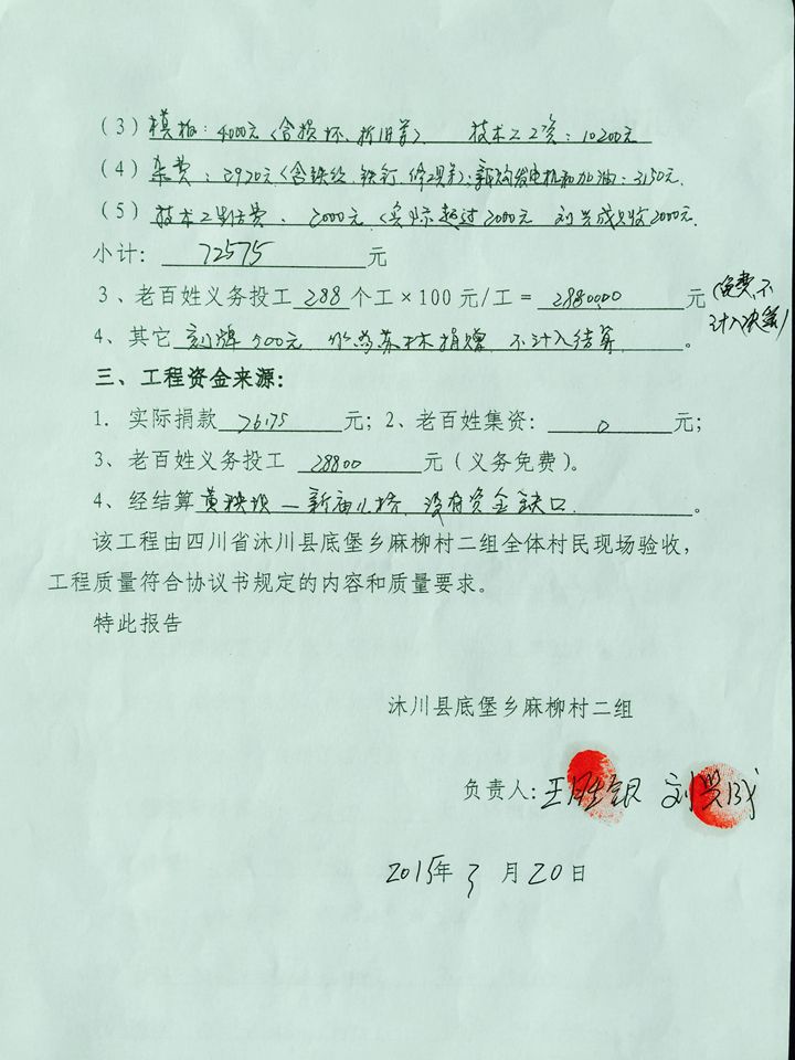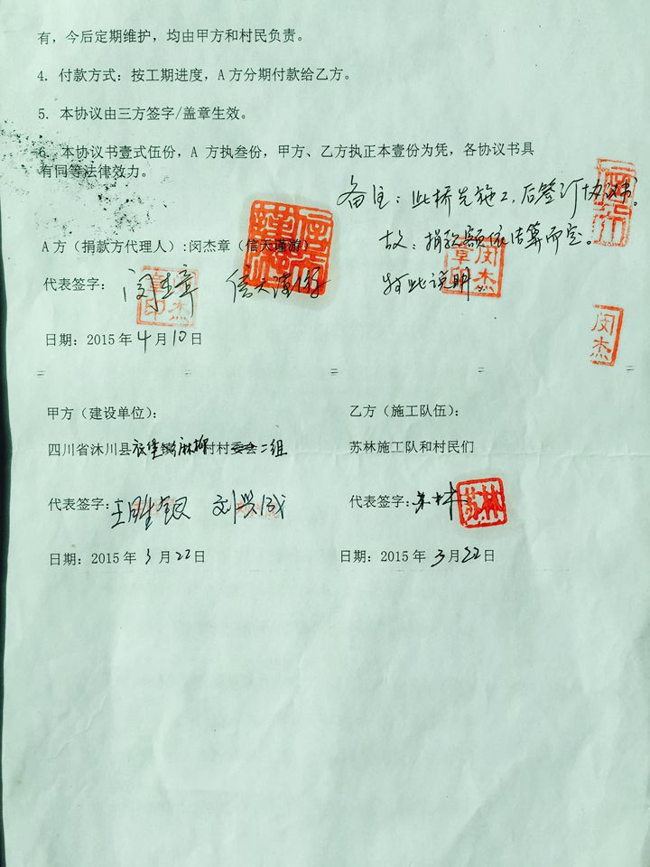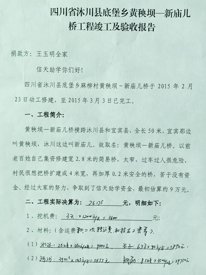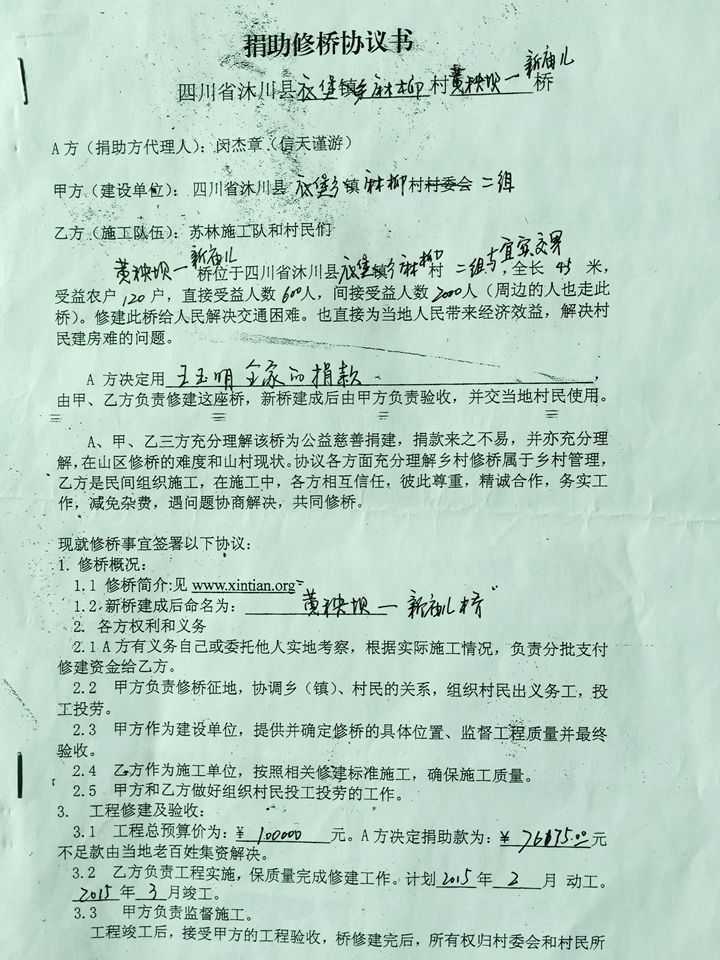 此桥先施工扩建,后签订协议书,原估算9-10万元,王玉明捐款10万元,按结算金额签订协议书,余款与王玉明协商,用于下次修路修桥之用。