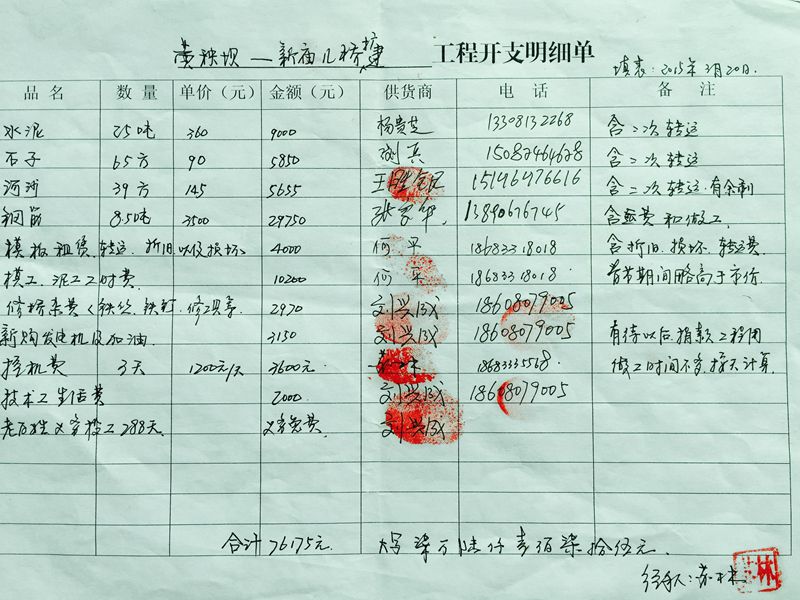 黄秧坝-新庙儿大桥工程结算开支清单