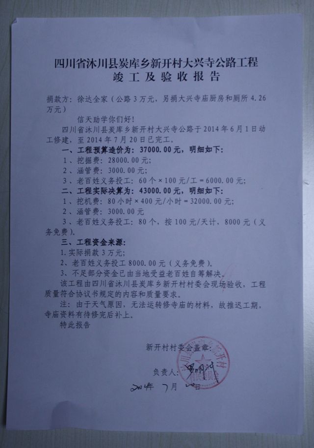 以上大兴寺公路和寺庙维修和厨房、厕所一共捐款72600元。