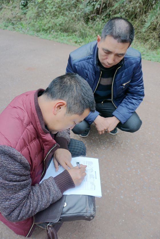 施工队长苏林和当地村里人在记录修路资料。