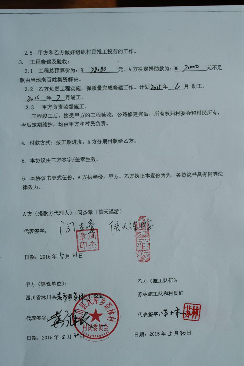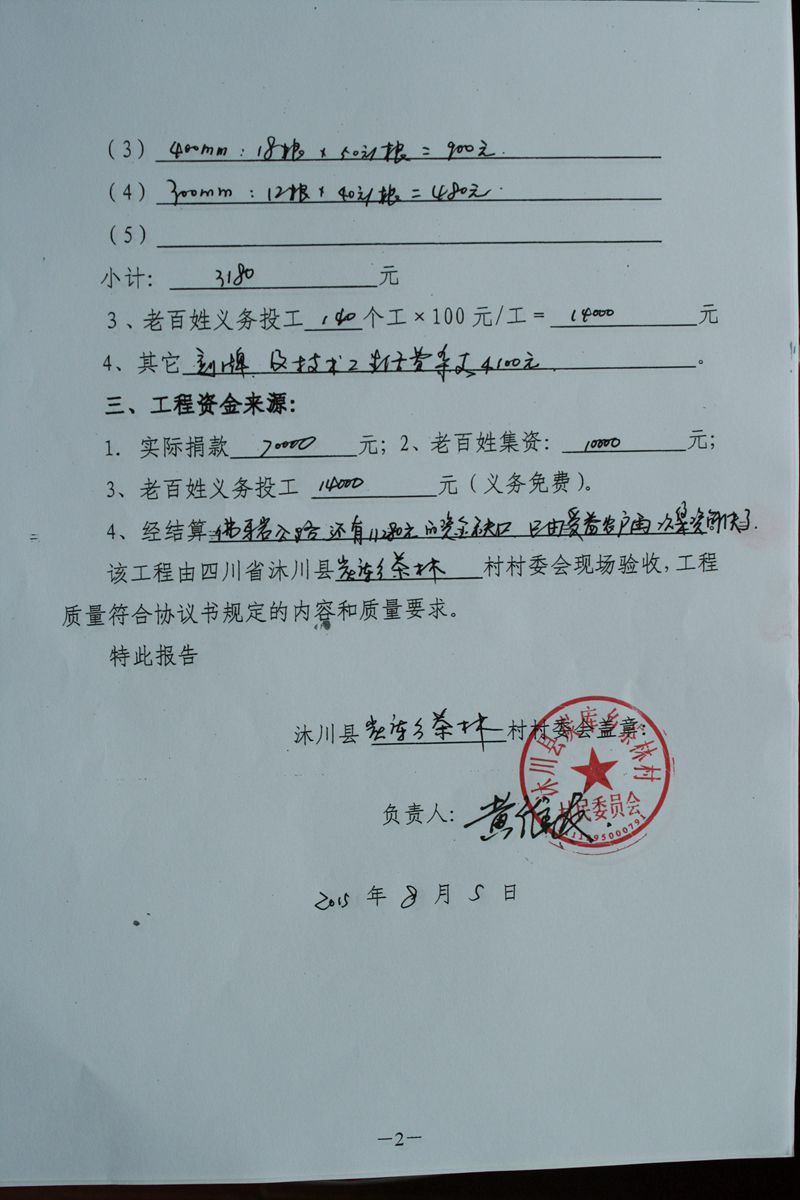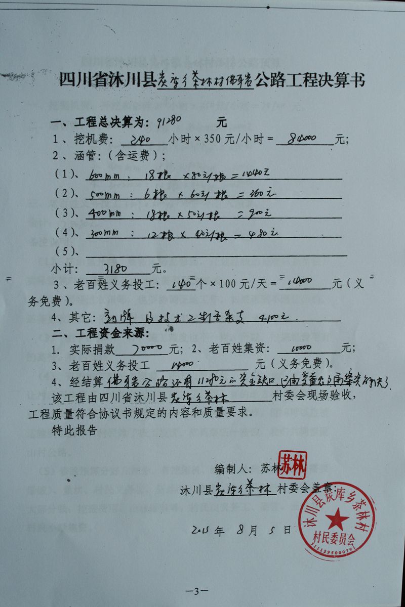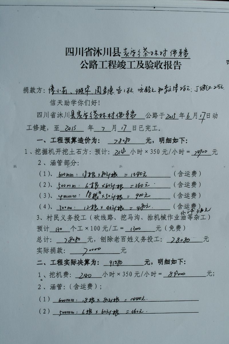 (5)修路预算分好几部分,有挖掘机、涵管、炸药爆破(山崖需要爆破)、堡坎、村民义务工、征地等。修路,我们不全包,我们出一大部分钱:挖掘费用、山崖爆破等。村民出义务工、涵管、征地费、村民小额集资。