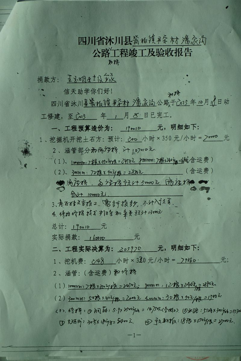 潘家沟公路和桥位于四川省沐川县箭板镇尹安村二组,全长约2.6公里,该路和桥直接受益45户,直接受接人数约160人,间接受益人数500人。该路要经过两处大河沟,河沟宽有6~8米,涨水有3米高左右,需修建两座桥。路起点:大河坝,终点A点:潘家沟,长度约1.1公里,B点黄桷树埂,长度约1.5公里。该处原老百姓已用人工挖了约1米宽的小路,用水泥铺了0.8宽的水泥路,上面可以骑摩托车,由于路窄,下雨路滑,前不久有一人骑车,滚下去摔死了。老百姓将投工投劳,并想办法集资30010元。