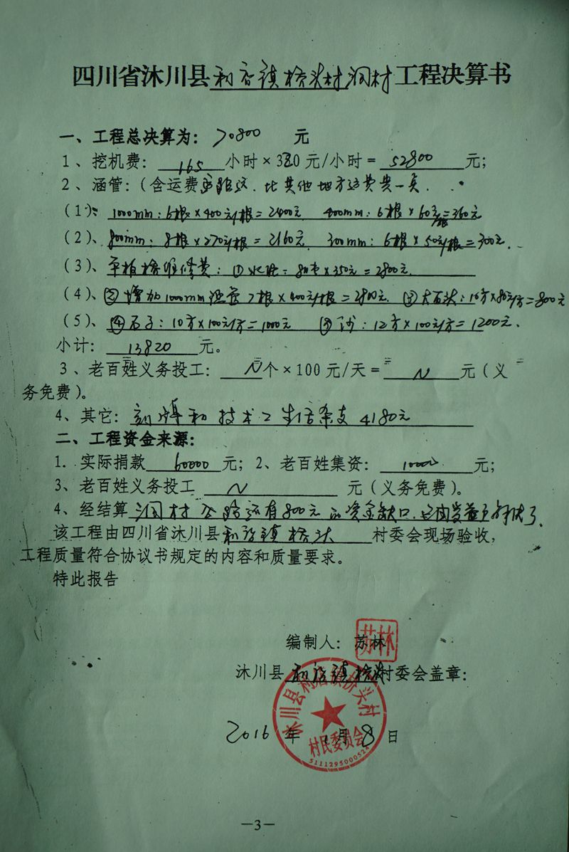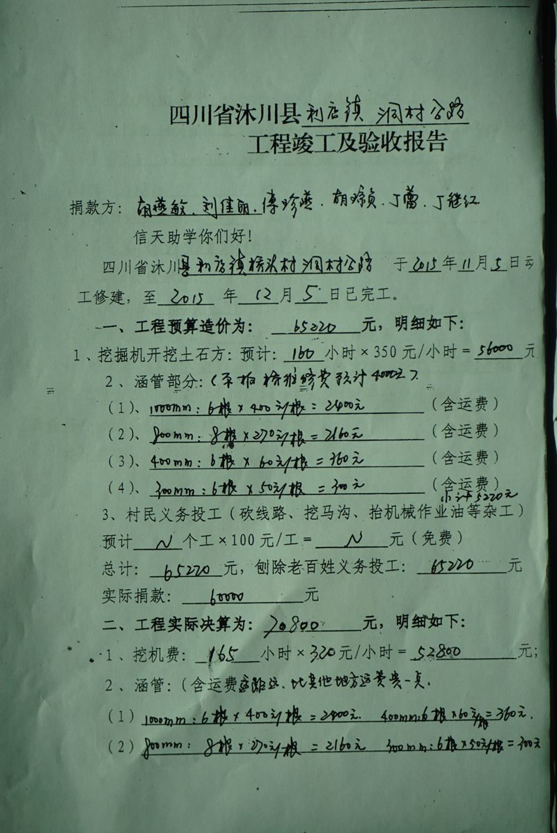 (5)修路预算分好几部分,有挖掘机、涵管、炸药爆破(山崖需要爆破)、堡坎、村民义务工、征地等。修路,我们不全包,我们出一大部分钱:挖掘费用、山崖爆破等。村民出义务工、涵管、征地费、村民小额集资。