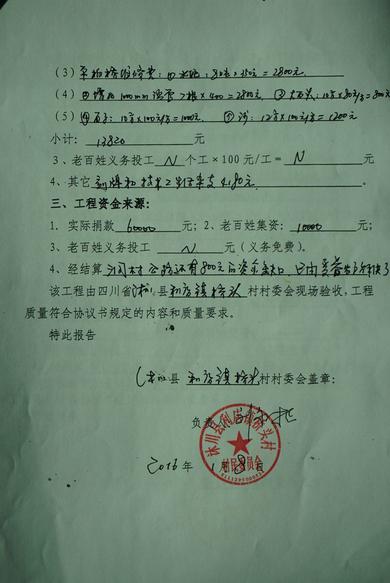 拟捐助:6万元,其他不足款及铺碎石的款由当地自找自筹,目前当地村民已集资34650元。
