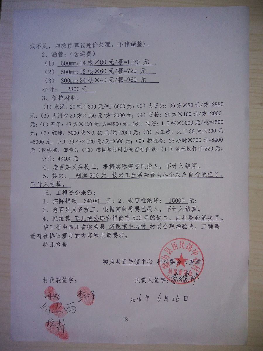 (5)修路预算分好几部分,有挖掘机、涵管、炸药爆破(山崖需要爆破)、堡坎、村民义务工、征地等。修路,我们不全包,我们出一大部分钱:挖掘费用、山崖爆破等。村民出义务工、涵管、征地费、村民小额集资。