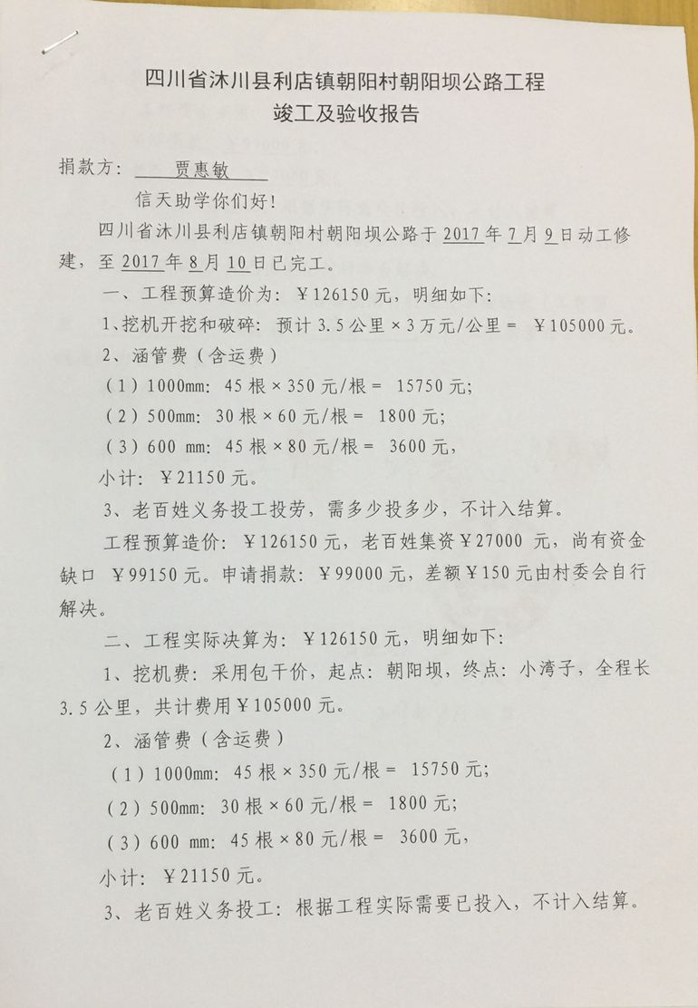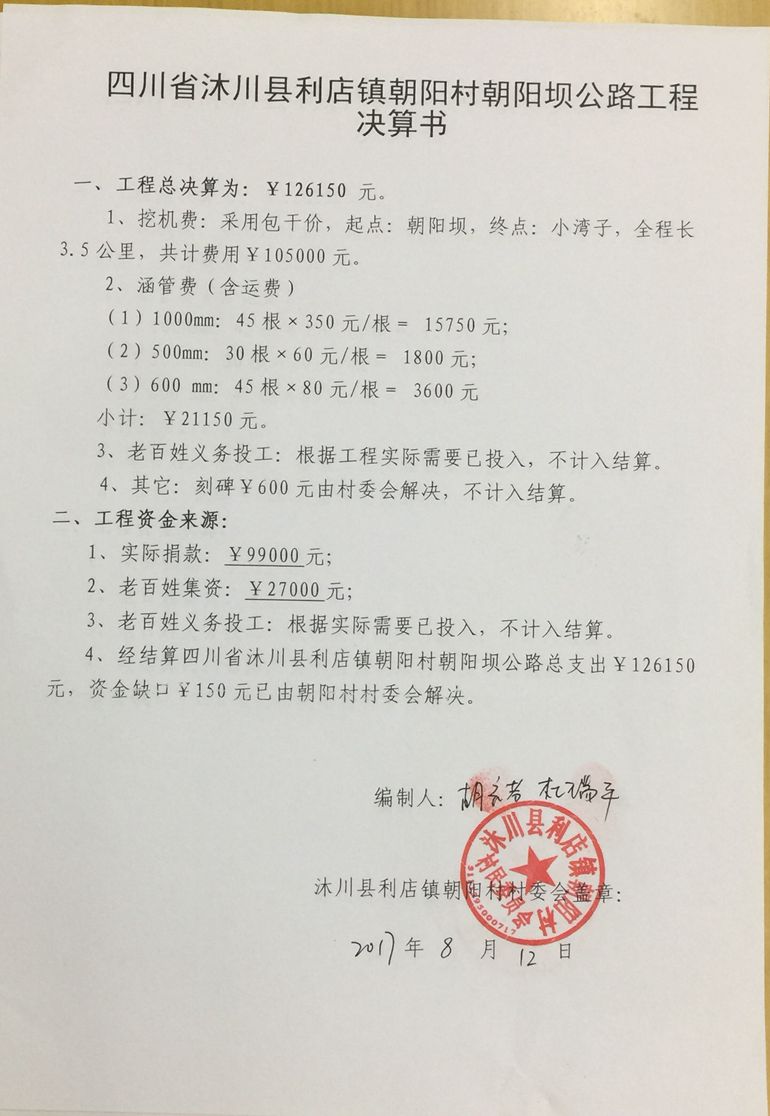 以上合计总价:¥126150元,老百姓集资27000元,尚有资金缺口99150元。