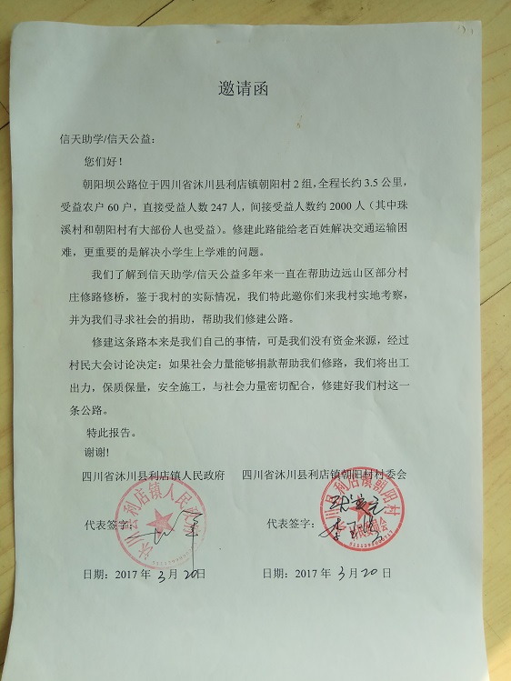 朝阳坝公路位于四川省沐川县利店镇朝阳村2组,起点:朝阳坝,终点:小湾子,全程长约3.5公里,受益农户60户,直接受益人数 247人,间接受益人数约2000人(其中珠溪村和朝阳村有大部份人也受益)。修建此路能给老百姓解决交通运输困难,更重要的是解决小学生上学难的问题。村民修路决心很大,全力集资,450元/户,共集资27000元,计划修通土路、支路、涵管、并铺设部份路面块石,力争雨季也能通车。