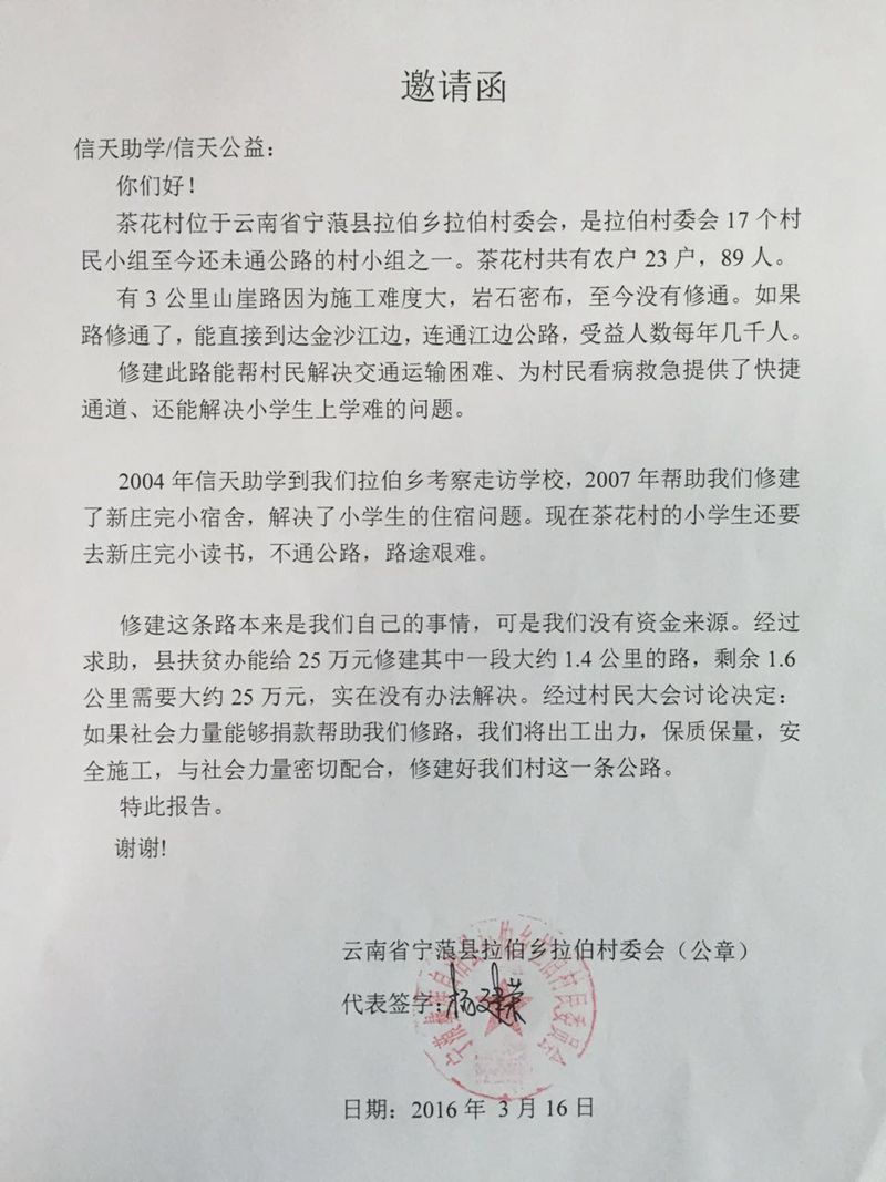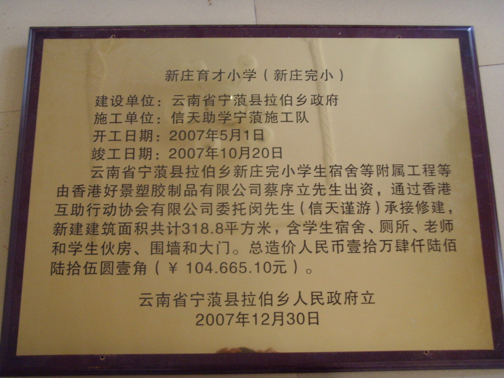 我们在2007年为宁蒗县拉伯乡新庄完小学修建了宿舍,茶花村到学校不通公路,孩子们到学校读书,要走岩崖山路,非常危险,但是那条路施工难度极大,需要大量的资金,现在整整过了9年,终于可以给孩子们修这条路了。