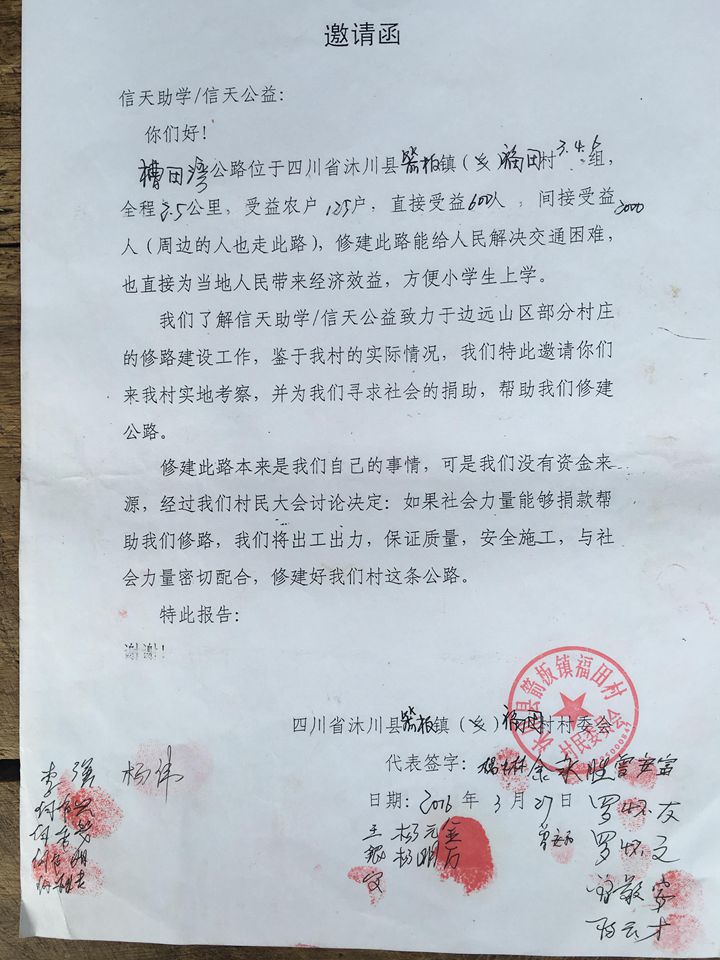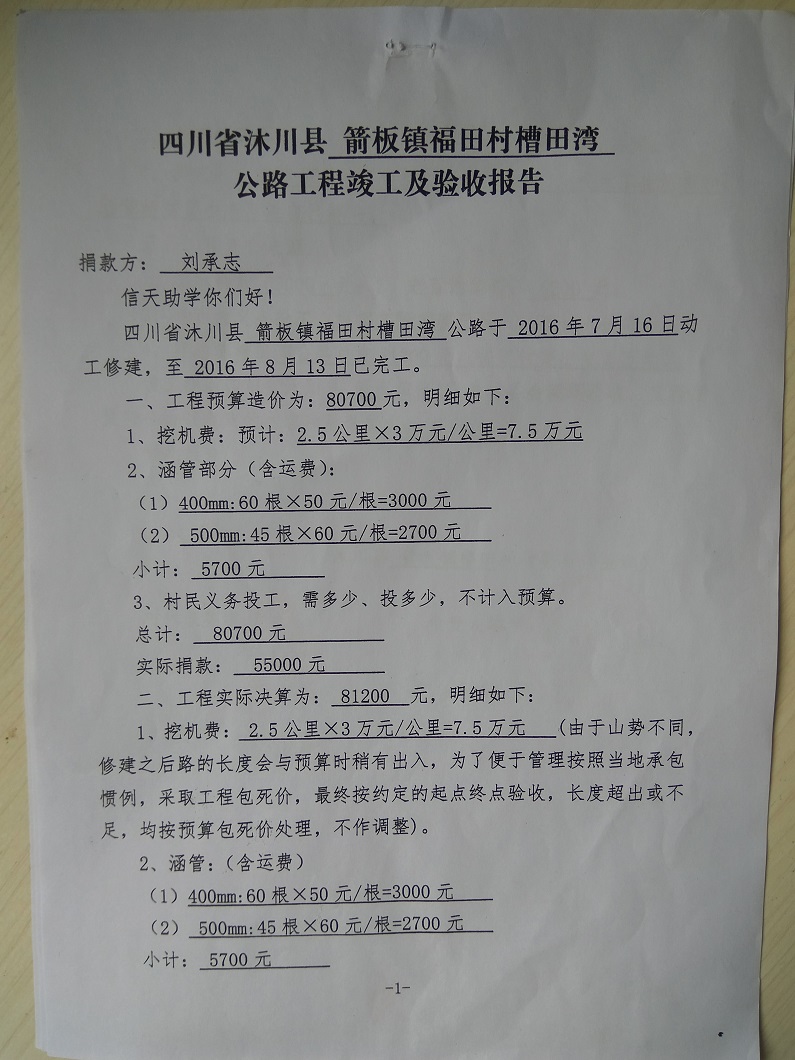 5、请用一颗平常心修路。我们欢迎捐助者去参观修好的路,但请勿大队人马去很多人,做公益是好事但请勿扰民。