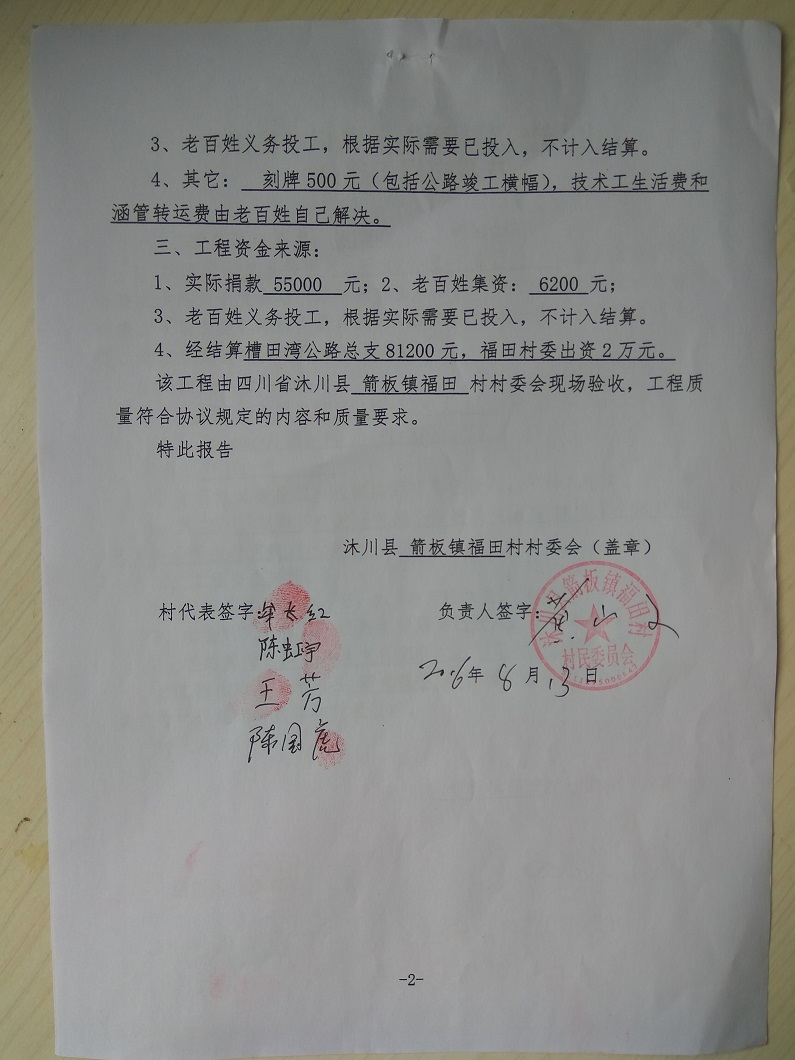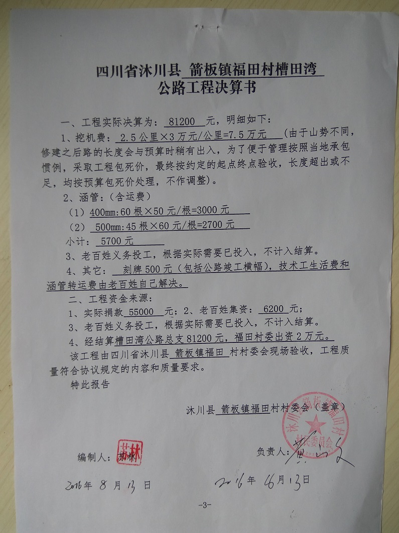 (5)修路预算分好几部分,有挖掘机、涵管、炸药爆破(山崖需要爆破)、堡坎、村民义务工、征地等。修路,我们不全包,我们出一大部分钱:挖掘费用、山崖爆破等。村民出义务工、涵管、征地费、村民小额集资。