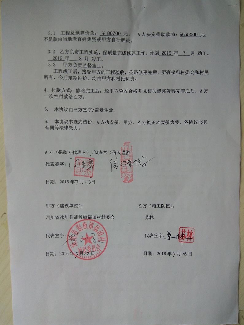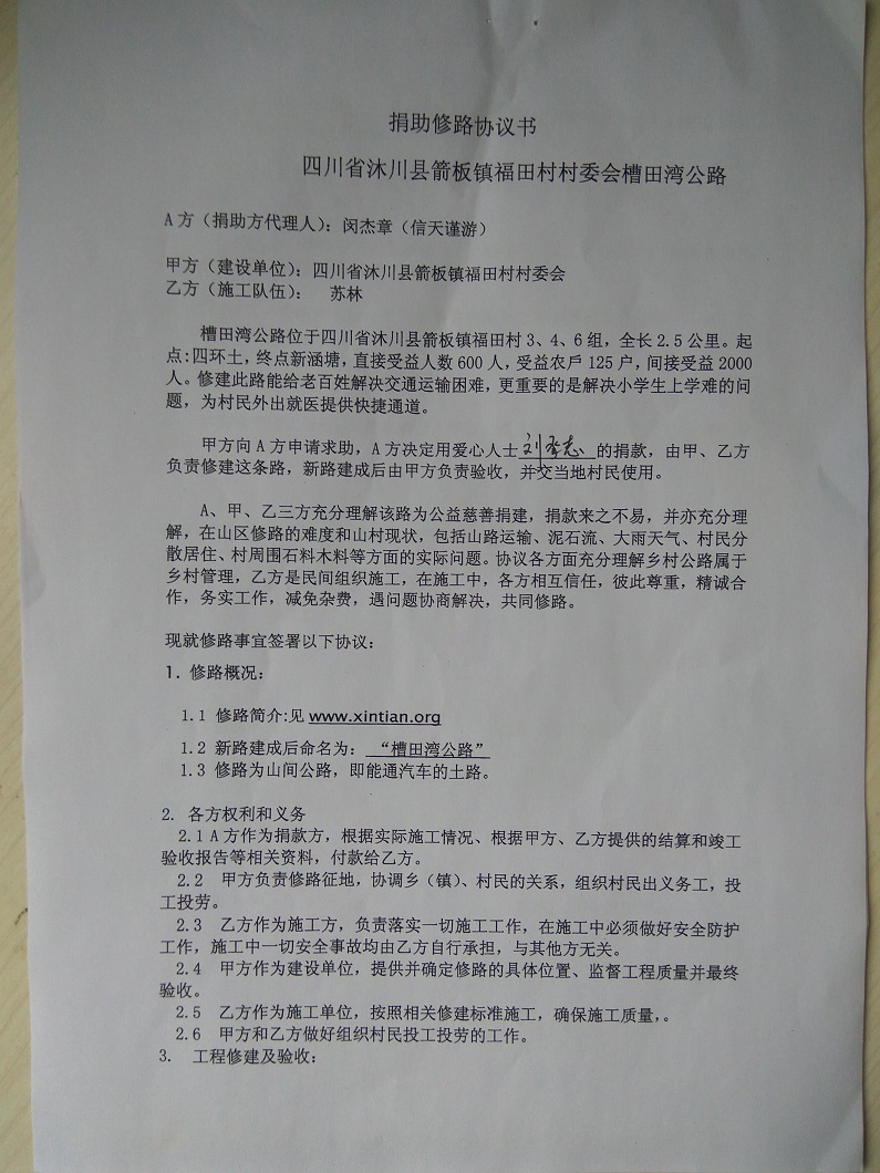 4、请尊重自然规律,修路如果遇到大暴雨和其他恶略天气该停工就停工,捐款人不能违背自然规律干预施工进度,不能要求强行赶工期。