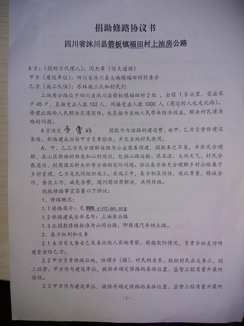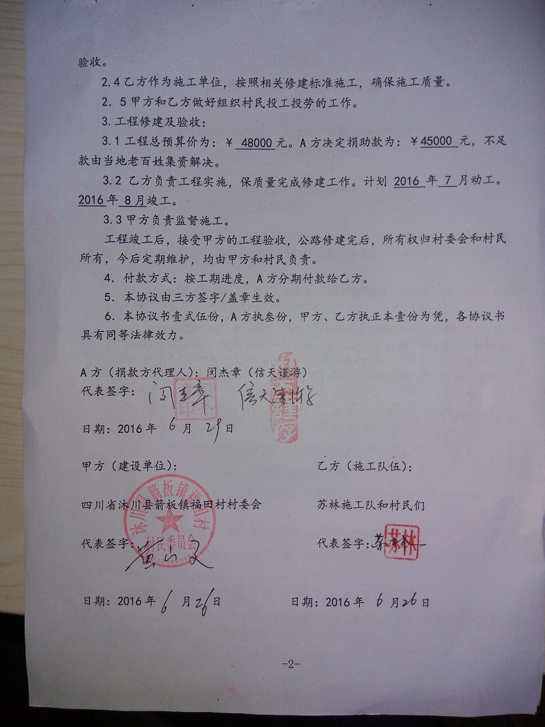 4、请尊重自然规律,修路如果遇到大暴雨和其他恶略天气该停工就停工,捐款人不能违背自然规律干预施工进度,不能要求强行赶工期。
