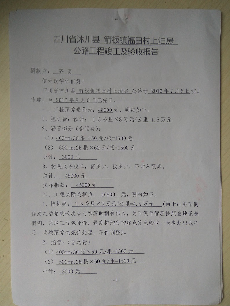 拟捐款45000元,此路捐款人最后刻牌子的名字:齐勇。