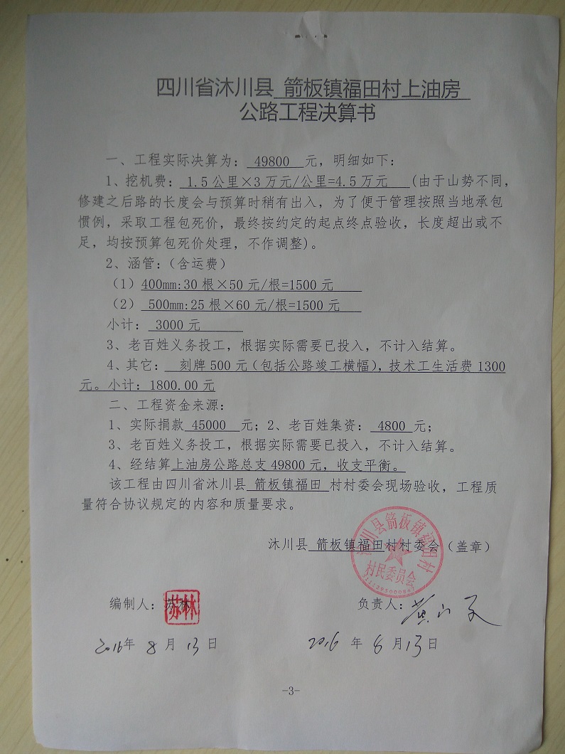 (5)修路预算分好几部分,有挖掘机、涵管、炸药爆破(山崖需要爆破)、堡坎、村民义务工、征地等。修路,我们不全包,我们出一大部分钱:挖掘费用、山崖爆破等。村民出义务工、涵管、征地费、村民小额集资。