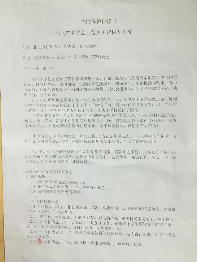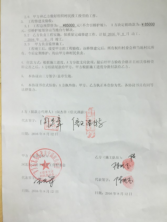 修桥捐款85000元,已经全部支付完毕,超出1653元由当地自理。