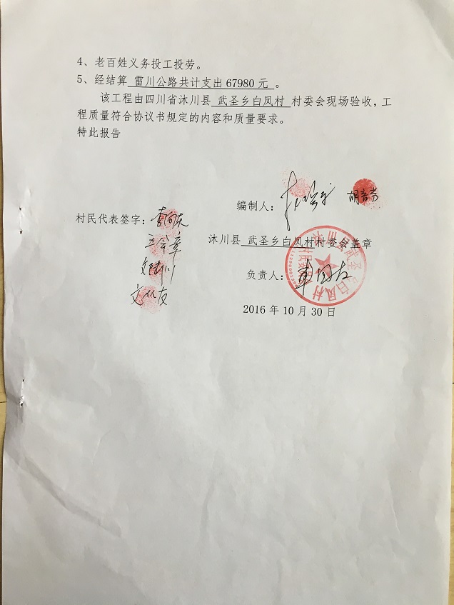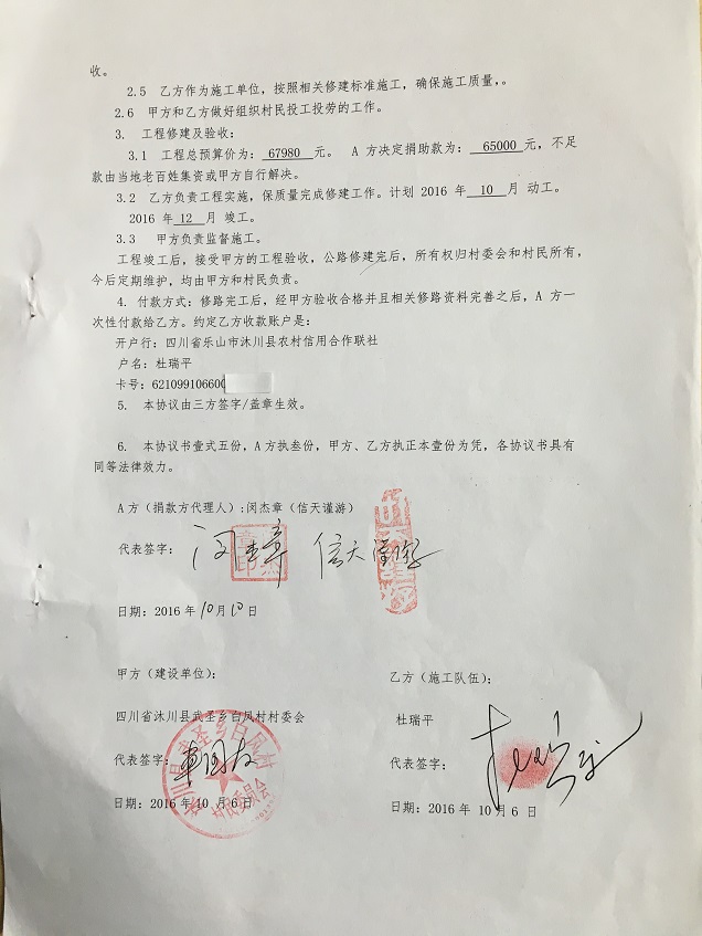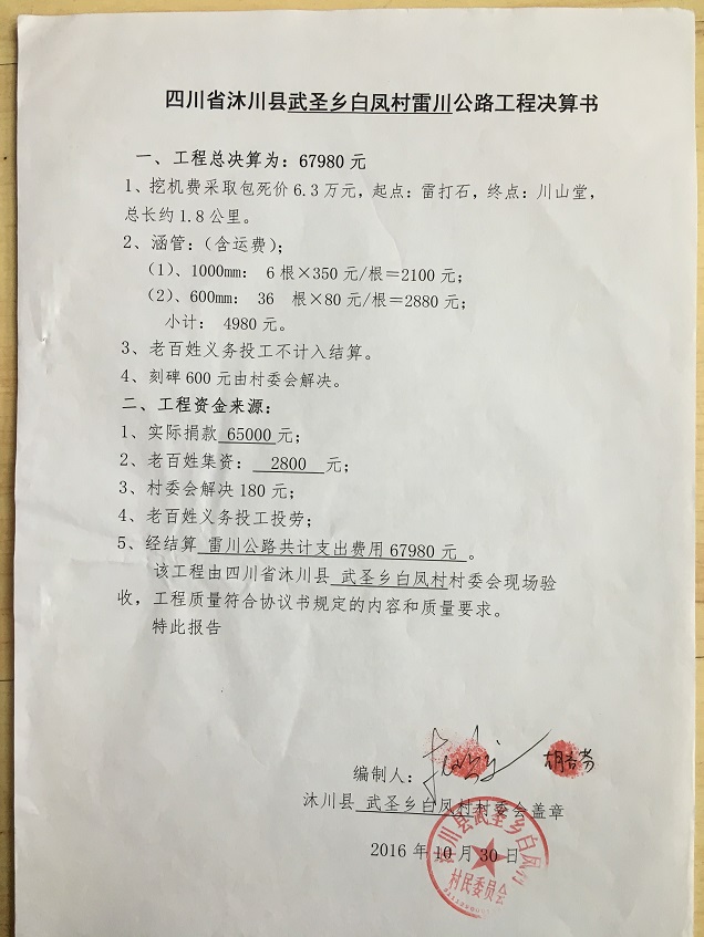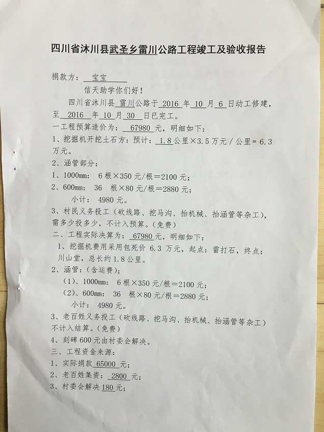 (5)修路预算分好几部分,有挖掘机、涵管、炸药爆破(山崖需要爆破)、堡坎、村民义务工、征地等。修路,我们不全包,我们出一大部分钱:挖掘费用、山崖爆破等。村民出义务工、涵管、征地费、村民小额集资。