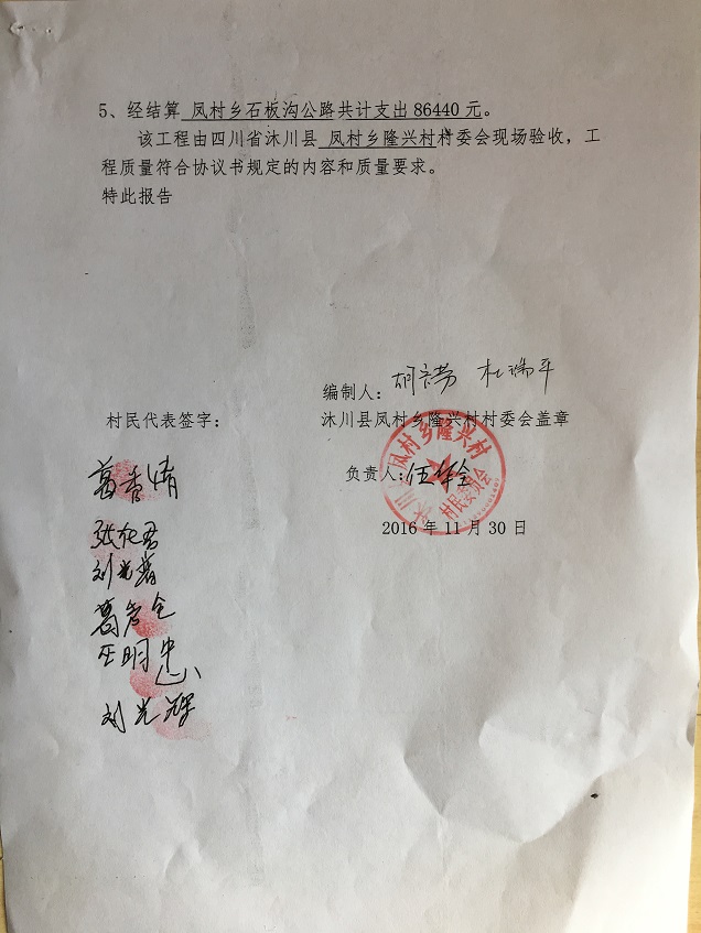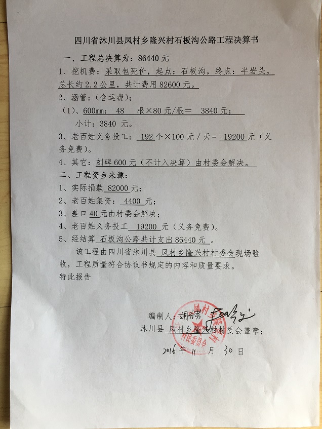 (5)修路预算分好几部分,有挖掘机、涵管、炸药爆破(山崖需要爆破)、堡坎、村民义务工、征地等。修路,我们不全包,我们出一大部分钱:挖掘费用、山崖爆破等。村民出义务工、涵管、征地费、村民小额集资。