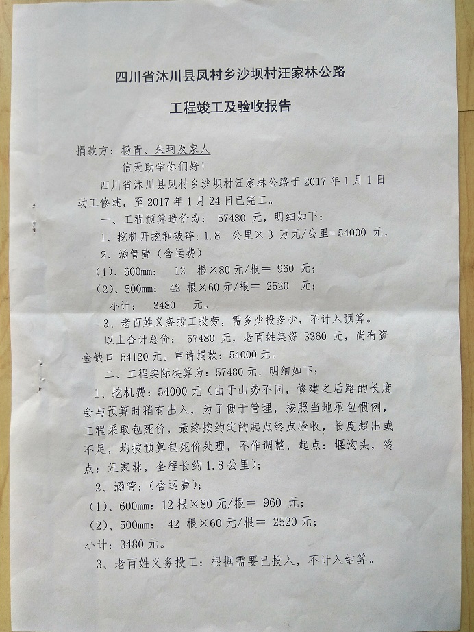 (5)修路预算分好几部分,有挖掘机、涵管、炸药爆破(山崖需要爆破)、堡坎、村民义务工、征地等。修路,我们不全包,我们出一大部分钱:挖掘费用、山崖爆破等。村民出义务工、涵管、征地费、村民小额集资。