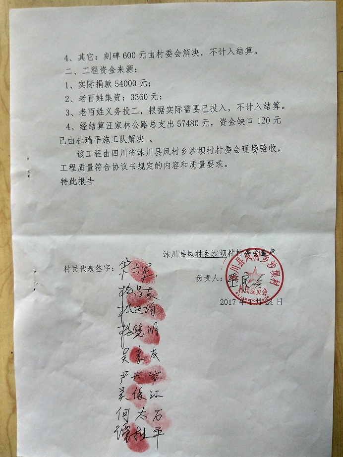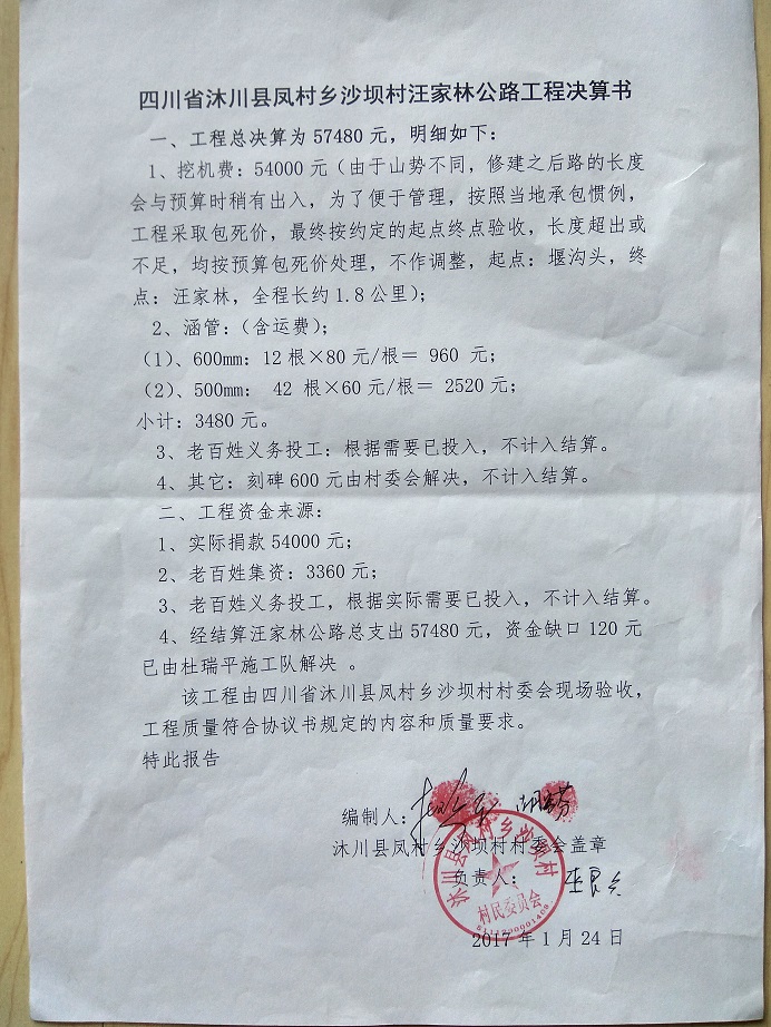 以上合计总价: 57480 元,老百姓集资 3360 元,尚有资金缺口 54120元。