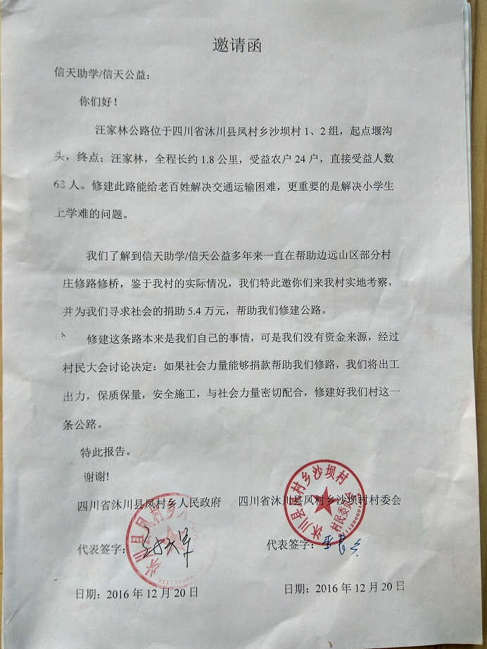 汪家林公路位于四川省沐川县凤村乡沙坝村1、2组,起点:堰沟头,终点:汪家林,全程长约1.8公里,受益农户24户,直接受益人数68人。修建此路能给老百姓解决交通运输困难,更重要的是解决小学生上学难的问题。村民修路决心很大,全力集资,140元/户,共集资 3360 元,计划修通土路、支路、涵管、并铺设部份路面块石,力争雨季也能通车。