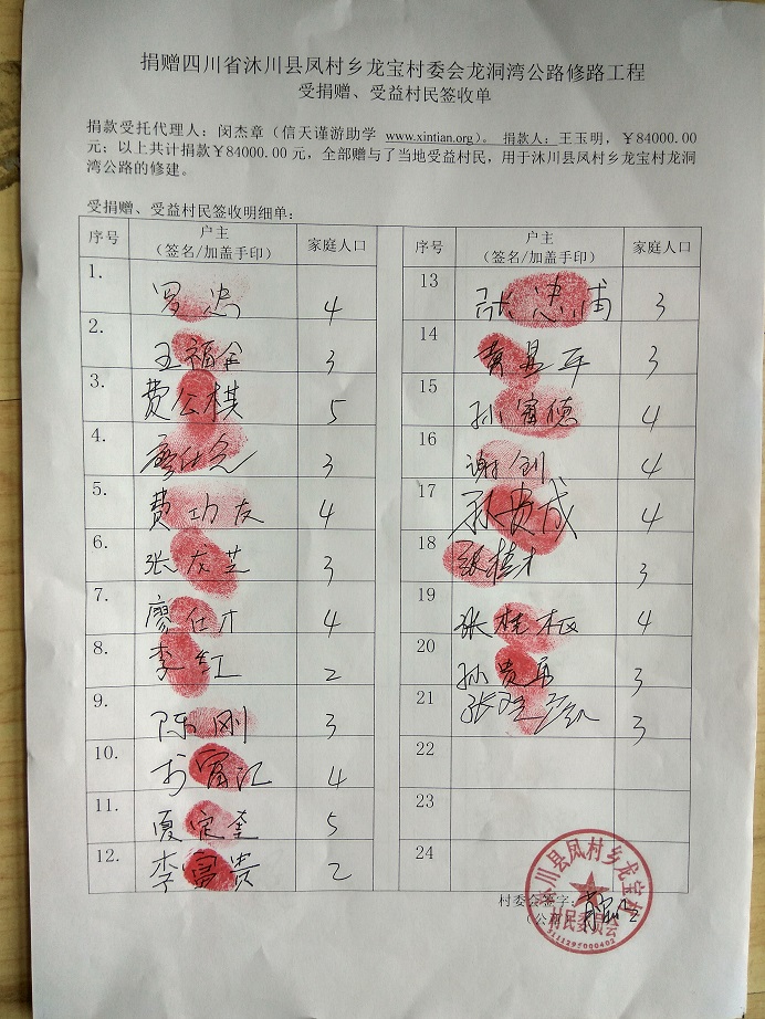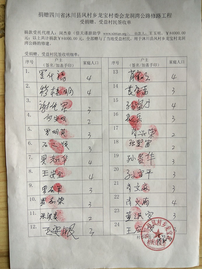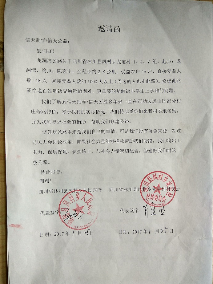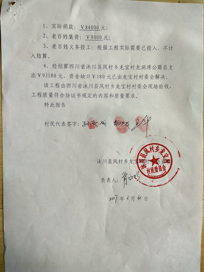 龙洞湾公路位于四川省沐川县凤村乡龙宝村1、4、7组,起点:龙洞湾,终点:陈家山,全程长约2.8公里,受益农户45户,直接受益人数148人,间接受益人数约1000人以上(周边的人也走此路)。修建此路能给老百姓解决交通运输困难,更重要的是解决小学生上学难的问题。村民修路决心很大,全力集资, 200 元/户,共集资 9000 元,计划修通土路、支路、涵管、并铺设部份路面块石,力争雨季也能通车。