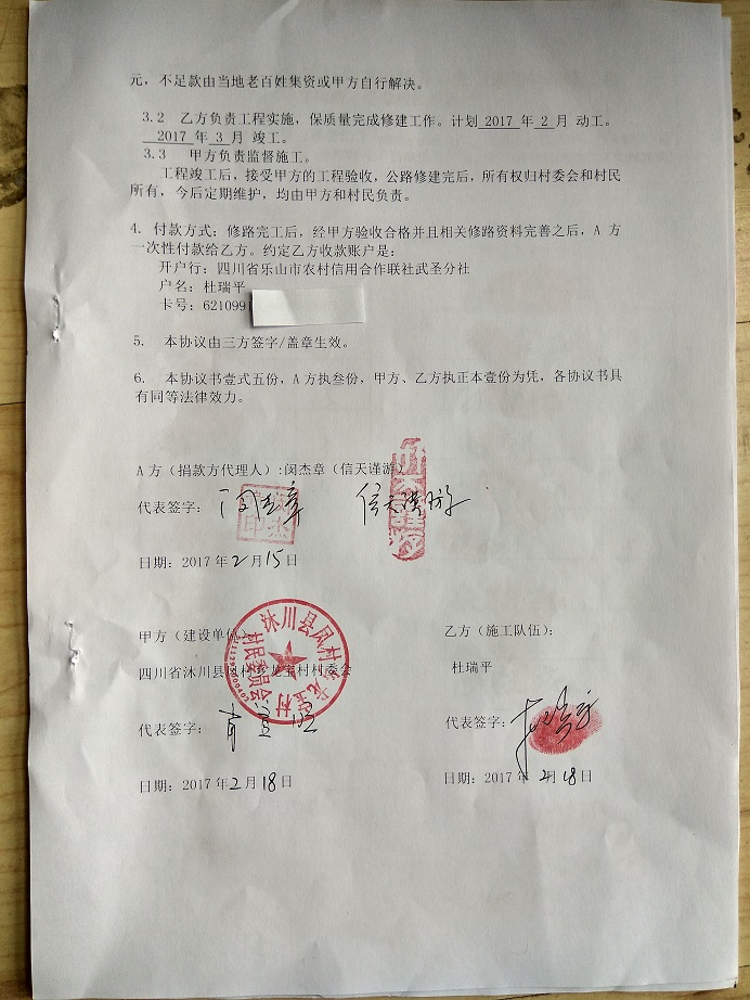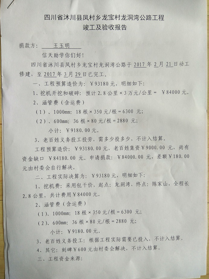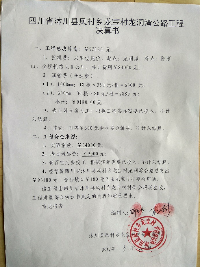 (5)修路预算分好几部分,有挖掘机、涵管、炸药爆破(山崖需要爆破)、堡坎、村民义务工、征地等。修路,我们不全包,我们出一大部分钱:挖掘费用、山崖爆破等。村民出义务工、涵管、征地费、村民小额集资。