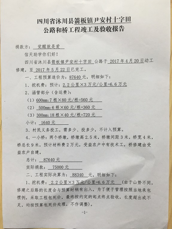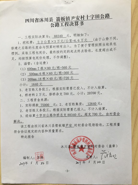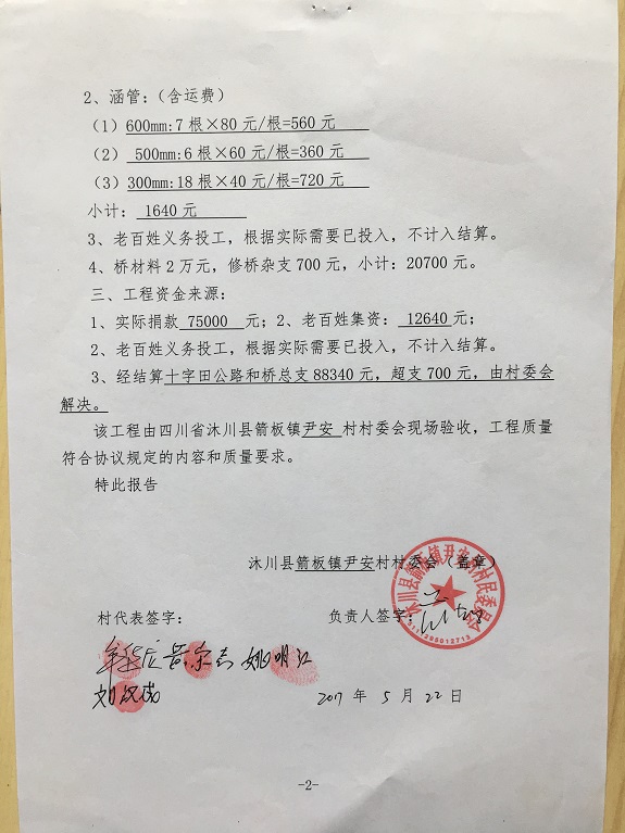 (5)修路预算分好几部分,有挖掘机、涵管、炸药爆破(山崖需要爆破)、堡坎、村民义务工、征地等。修路,我们不全包,我们出一大部分钱:挖掘费用、山崖爆破等。村民出义务工、涵管、征地费、村民小额集资。