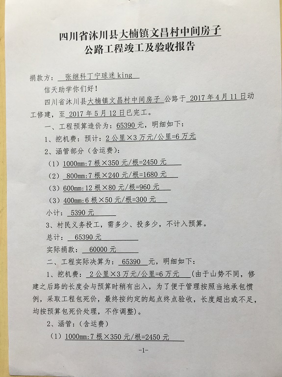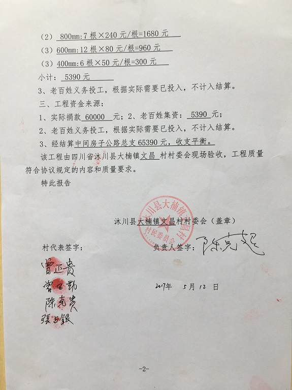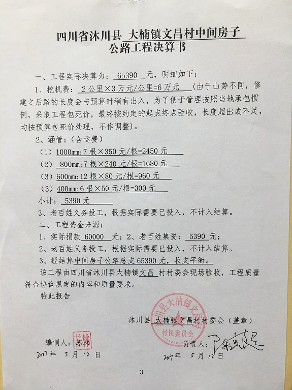 合计总价:65390元,老百姓自筹涵管资金5390元。