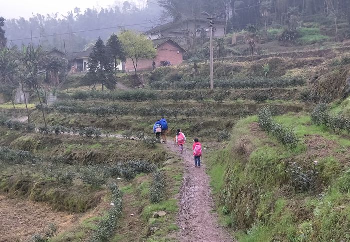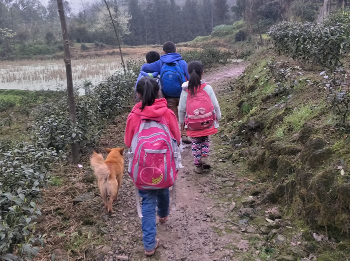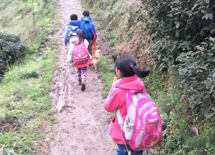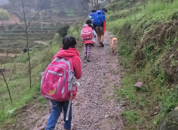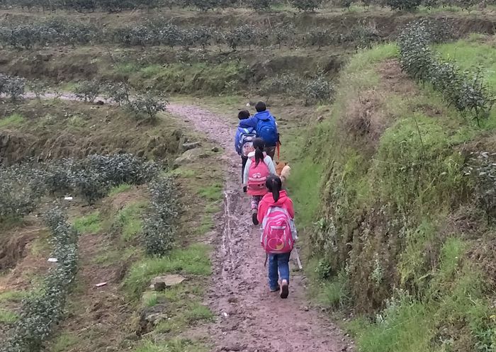 小学生上学之路。如果修通了路,小学生就可以骑车或者坐车上学了。