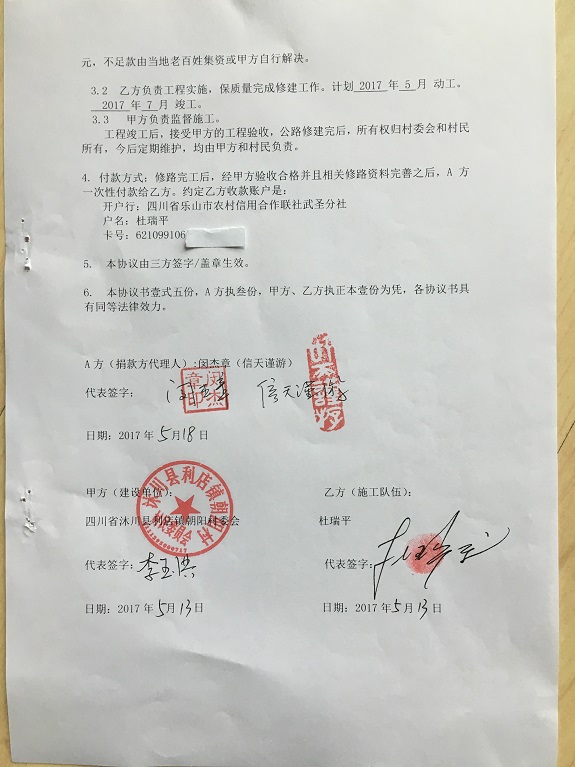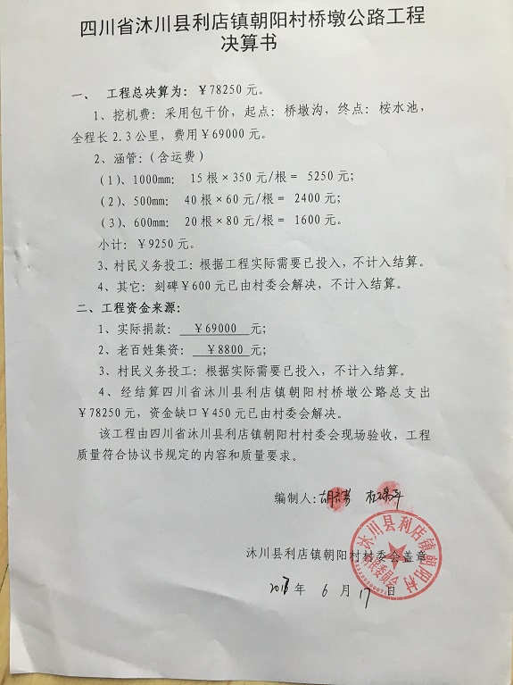 (5)修路预算分好几部分,有挖掘机、涵管、炸药爆破(山崖需要爆破)、堡坎、村民义务工、征地等。修路,我们不全包,我们出一大部分钱:挖掘费用、山崖爆破等。村民出义务工、涵管、征地费、村民小额集资。