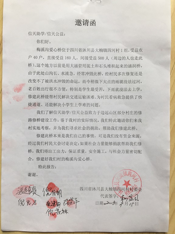 梅溪沟爱心桥位于四川省沐川县大楠镇四河村一组。该桥直接受益农户40户,直接受益人数160人,间接受益人数500人。这个地方以前是用大涵管用泥土和石头堆积起来的涵洞桥,由于此处山沟长,水流急经常冲毁此处涵洞桥,经村民多次修复,还是改变不了被洪水冲毁的命运。而今稍微下大点的雨就没法过河,老百姓出行很不方便,特别是学生最受苦,下雨雨就没法去上学。