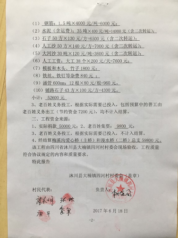 老百姓自筹资金:9800元;普工由老百姓义务出工(节约资金7200元),尚有50000元的资金缺口。