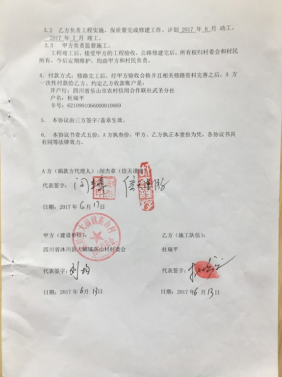 (4) 有的地方村民太困难,在大山更深处,这样,我们就尽量不让村民再集资了,只投工投劳就可以了。而,有的地方小水泥路就通到了山脚下,我们修路来接通外界的小水泥路,这样,材料可以直接运输到山脚下,村民除了投工投劳,就再集资一些钱,我们共同修建山村公路。